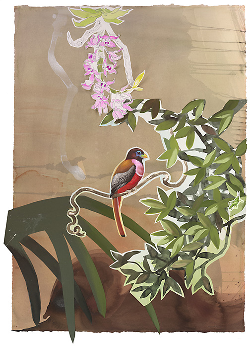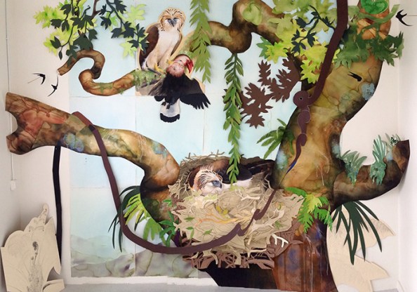 In this exhibit, David created three-dimensional collages by carefully assembling cut-out layers of painted figures (birds, branches, vines, flowers). The birds stood out, brilliant and iridescent against muted matte backgrounds. I particularly liked the rufous hornbill, which had a noble look to it, although I felt ambivalent about David’s largest artwork, a 12-foot-high life-size painting of a Philippine eagle nest site. (Philippine eagles may be tragic figures, but their peculiar, uneven headdress makes them look a little…silly.)