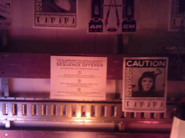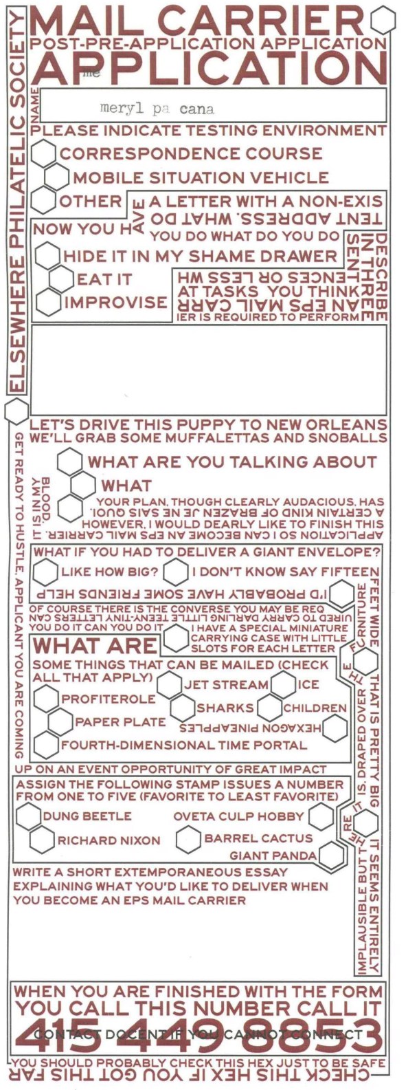 4. The Elsewhere Philatelic Society. Having participated in the Jejune Institute, I had an inkling that the Elsewhere Society was not what it seemed. On the surface, it seemed to be a civic-minded organization of mail carriers, enabling you to write postcards to other box trucks or apply (via typewriter) to become a postcard courier. I sat down at a typewriter with my application, but almost immediately despaired, finding it impossible to properly position the keys. I also noted that the Elsewhere organizer was rejecting other people’s applications, even after they’d succeeded in filling them out. It seemed as if a phone number at the bottom of the application* might clue me into the Society’s motives, but sadly my phone was out of juice.